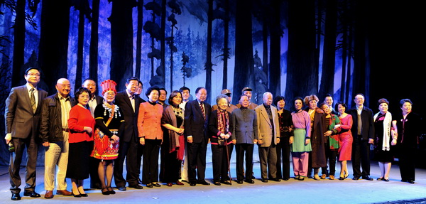 其后所有演员上场集体高歌“甘洒热血写春秋”,雄壮的歌声深深地感染了观众,一时间全场掌声雷动,献花者络绎不绝、场面蔚为壮观。老领导龚学平、蒋以任、朱达人、朱寄平,市政协副秘书长张丽,老艺术家李蔷华等走上台来与演员们一一握手祝贺演唱会成功并合影留念。