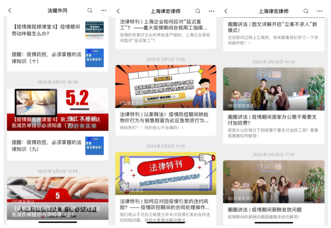 依法战疫保障社会稳定。律师为区卫生健康委提供专业法律服务和支持,参与撰写疫情通报,做好区疫情防控工作书面材料的法制审核。为做好疫情期间的法律宣传、法律服务,律宏所响应区总工会的号召,相继推出“毓秀嘉定·法治‘工’开课——防疫·微剧场、防疫·微课堂、防疫·微服务”,律师们拍摄了配套视频,使企业和劳动者能更生动形象地了解和知晓特殊时期的法律规定。疫情期间,还相继推出了法律特刊、圈圈讲法、“防疫·直播间、防疫·微评估”等新举措,采用在线直播课程的形式,构建法治框架,提供律师在线解答和互动交流。并将继续以“对标新需求、整合新思路、运用新媒体、开拓新渠道、引领新趋势”为理念,“零距离”服务企业劳动用工合法合规,“零距离”维护职工合法权益,协力推进劳动关系和谐稳定,更好维护疫情期间社会稳定大局。