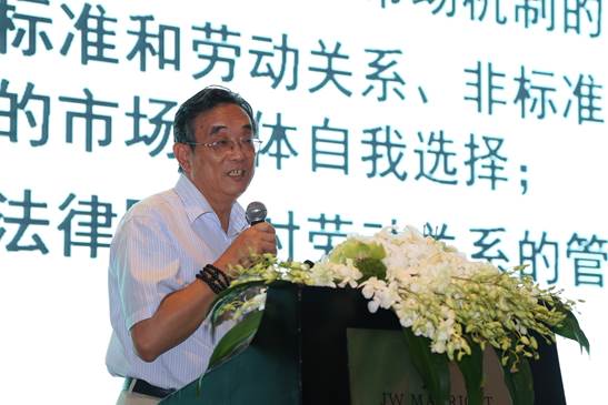 第一位演讲嘉宾是董保华教授,演讲主题是“劳动合同法十大失衡的再阐述”。董保华教授首先指出改革开放的成功说明我们做对了什么,当前的经济下行说明我们做错了什么。中央目前提出的“降成本的重点是增加劳动用工的灵活性”已经预示着《劳动合同法》进入修订议程。目前,国家对于企业用工灵活性问题正在反思。