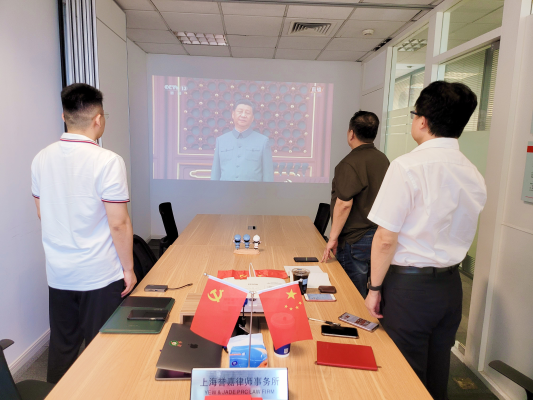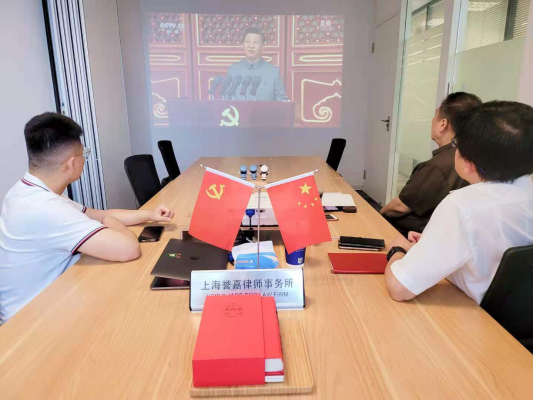 2021年7月1日上午8时,上海誉嘉律师事务所组织收看庆祝中国共产党成立100周年大会直播,在支部书记贾成英同志、事务所主任田原的带领下,大家或在事务所会议室,或在家中、路途上,通过“学习强国”共同仔细聆听了习近平总书记在大会上的重要讲话。