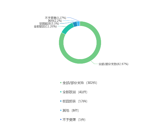 通过对左图显示一审裁判结果的可视化分析可以看到,当前条件下全部/部分支持的有302件,占比为82.97%;全部驳回的有41件,占比为11.26%;驳回起诉的有12件,占比为3.30%。
