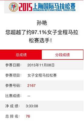 11月8日,建领城达所孙艳、王敏、周吉高律师参加了上海国际马拉松赛并喜获佳绩。孙艳律师继北京马拉松赛获得女子全程百强之后,又于本次赛事中取得3小时33分钟的好成绩,再次进入百强,获女子全程第76名(国际排名),比北马名次提升了19名。另据不完全统计,孙艳律师已成为上海乃至全国跑得最快的律师。