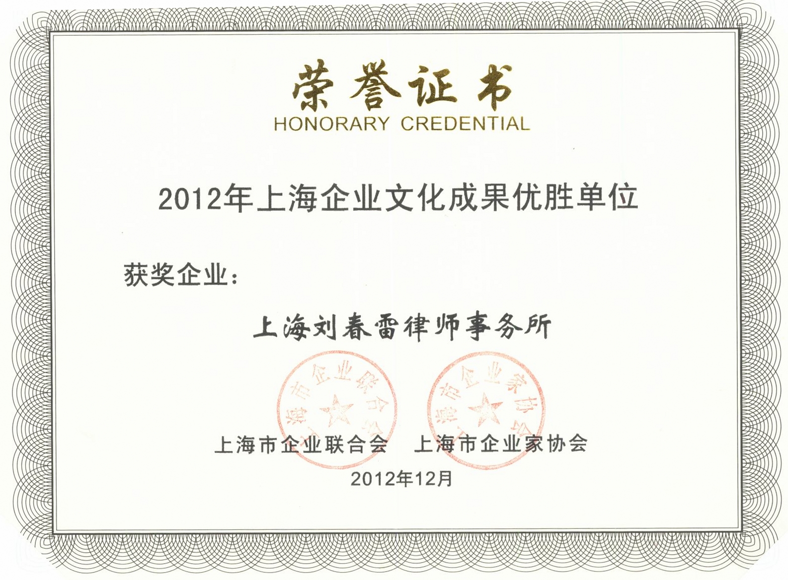 2012上海企业文化建设成果评审自2012年8月启动,历经单位自荐、组织考查、专家评议等评审环节。最后,中石化上海公司、上海建工集团、上汽集团、上海大众、上海通用、上海三菱电梯、绿地控股、光明集团等100家企业脱颖而出获得优胜单位。能与上海市众多著名的航母级企业同获殊荣,刘春雷所全体成员倍感自豪。刘春雷律师表示,将继续坚持“以文化立所、文化兴所”的发展理念,力争在律所文化建设等发面多出成果,推动春雷所更好更快发展。