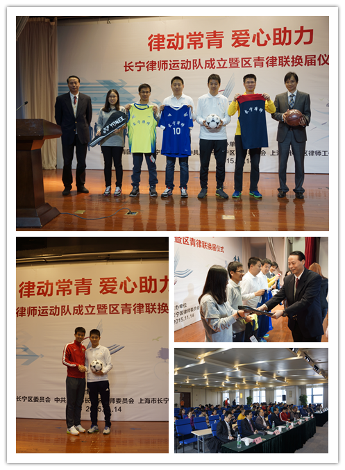 活动在区律工委主任、九州丰泽所主任陈刚律师的致词中缓缓拉开序幕。首先进行的是长宁律师运动队成立仪式,仪式由区律工委副主任、观韬上海分所蒋信伟律师分别为长宁律师篮球队、羽毛球队、足球队授予队服和装备。