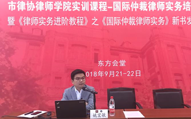 2018年9月21日,市律协律师学院联合国际贸易新利体育网站委员会、海事海商新利体育网站委员会共同举办的国际商事仲裁律师实务培训班暨《律师实务进阶教程》之《国际商事仲裁律师实务》新书发布会在交通大学凯原法学院二楼东方会堂举行。《国际商事仲裁律师实务》作为律师学院进阶教程系列第五本教材已于2018年6月出版。