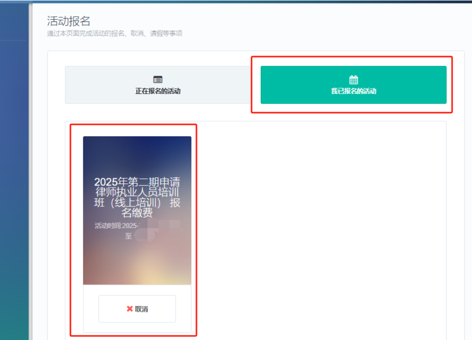 4.点击“已报名活动”,选择“2025年第二期申请律师执业人员培训班”,点击“缴费”;