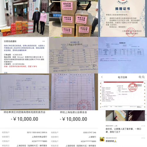 为支持疫情防控工作,全区律所在做好法律服务的同时,向抗疫一线共捐赠近2.5万余只医用口罩,近千件隔离衣、防护服,为疫情防控提供了物质支持。另外,还有律师响应上海市慈善基金会和市女律协的倡议,积极捐款,用于帮助抗疫工作。