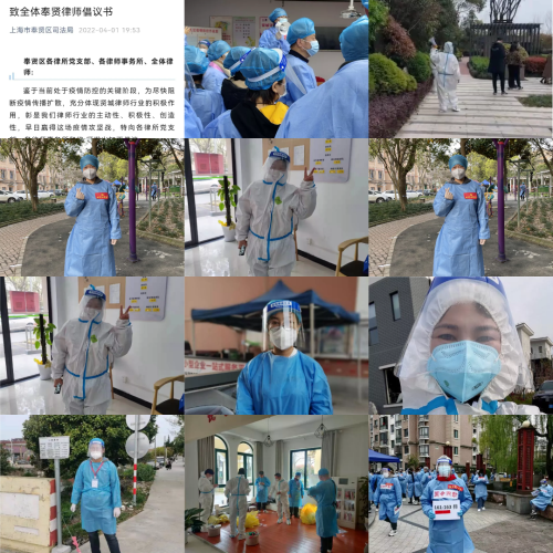 3月31日,区司法局组织成立支持柘林抗疫青年突击队,上海聚缘律师事务所包镇、李家杰律师、上海申诚律师事务所代冬妮、李渊琼律师、上海美谷律师事务所徐仕汉律师、上海徐卫红律师事务所工作人员周杰、上海信思法律师事务所李明明律师、上海方英律师事务所工作人员潘小龙等,不畏风险,挺身而出,主动报名参加,在柘林镇连续作战多日。他们以实际行动,展现了法律人的风采与担当。