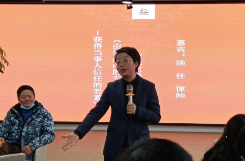 随后,汤佳律师以《由外而内的专业展示—获得当事人信任的要素》为题与青年律师进行交流。汤律师从各方面、多视角解析了“客户的分类;接触客户的执业素养与行为举止;如何获取展现自信和专业水平”等青年律师面对客户时的疑难问题,并现场教学、一对一指导在场青年律师如何更好地得到客户信任,增加成案率,为青年律师开阔了视野,提供了很好的经验指引。