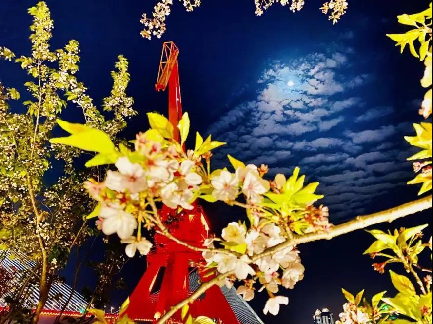 图解:4月6日,踱步江畔,月色如水,樱花摇曳,花瓣在夜空中飞舞。“寂寞空庭春欲晚,樱花枝头月正圆”,让人久久不舍离去:
