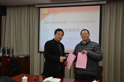 为深入贯彻十八届四中全会精神,树立依法治国理念,增强党员法治思维,提高党员运用法治方式分析、解决问题的能力,促进支部服务型党组织建设,1月14日,上海善法律师事务所党支部与上海社科院新闻研究所党支部签订了党建联建协议。善法所主任郑震捷律师与社科院新闻研究所支部书记、所长强荧代表双方签订了合作协议。今后,双方将本着“组织共建、优势互补、互帮互利、共同进步”的原则,各自发挥职业优势,在党课活动、组织生活等方面开展联建活动,通过提供法律咨询服务、理论研究等方式,促进理论与实际相融,增强双方党员的法治观念和理论素养,进一步提高党建科学化水平。
