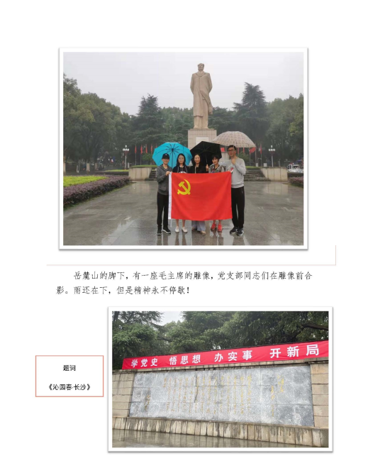 一代人有一代人的使命,一代人有一代人的责任和担当。本次长沙之行,虽然时间比较短,但是却收获满满。支部同志们一致认为:100年间,历史的场景发生了巨大变化,但红色精神依然弦歌不辍,中国青年那如火的青春始终照耀着国家和民族的未来!我们要牢记习近平总书记在庆祝中国共产党成立100周年大会上的强调“新时代的中国青年要以实现中华民族伟大复兴为己任,增强做中国人的志气、骨气、底气,不负时代,不负韶华,不负党和人民的殷切期望!”
