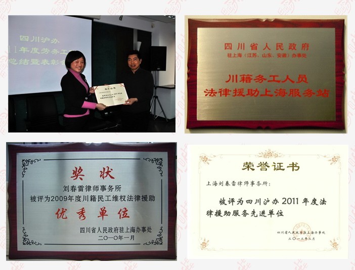 刘春雷所荣幸地成为四川省人民政府驻上海、江苏、山东、安徽办事处川籍务工人员法律援助站,连续三年蝉联四川省人民政府上海办事处法律援助先进集体。凸显了心系民众、服务为民的执业宗旨,树立了律师良好社会形象。