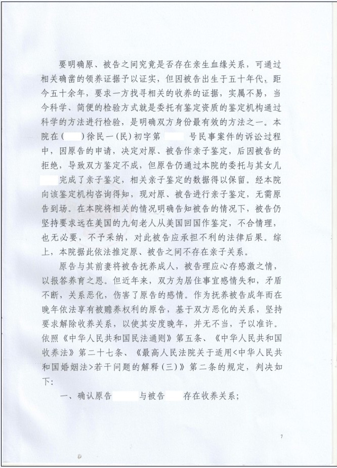 不得已,审判人员传唤被告何老先生的小女儿到庭,就其如拒绝做亲子鉴定的后果明确告知了被告何老先生的小女儿,而其还是执意不肯做亲子鉴定。法院遂根据《民法通则》第五条、《收养法》第二十七条和《婚姻法》司法解释(三)第二条的规定,确认了何老先生和小女儿之间存在收养关系,并同时判决解除了何老先生和小女儿之间的收养关系。